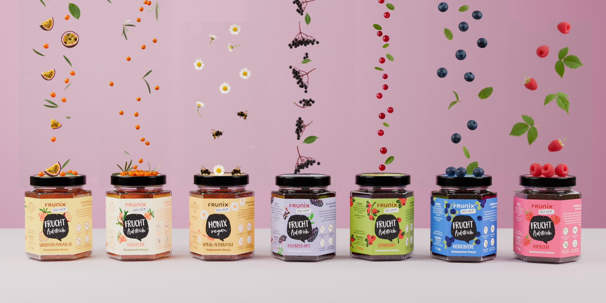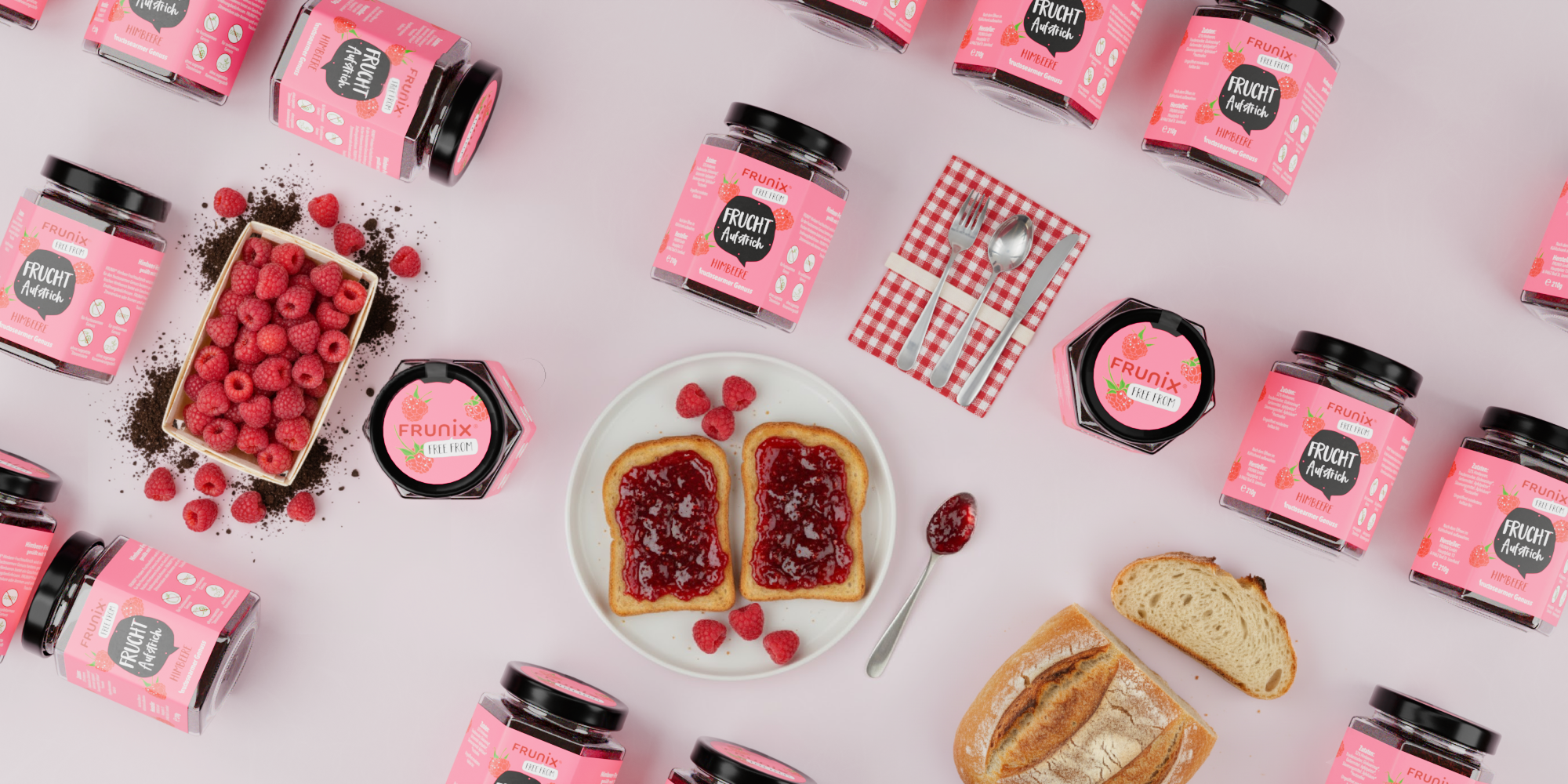 FrameKit renders food and drink packaging in 3D with accurate material properties including cardboard, foil pouches, glass, PET bottles, cans, and label print finishes. New flavours or packaging updates can be turned around from an existing base model, so brands are not starting from scratch every time the range changes.